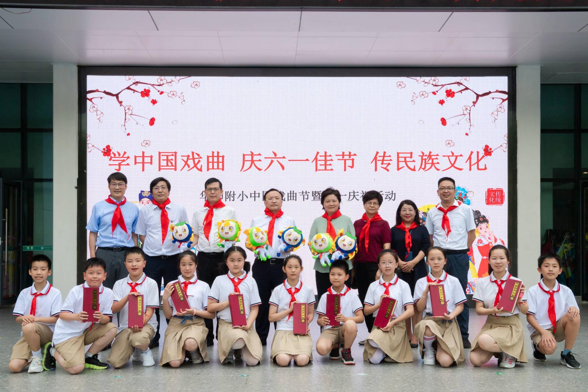 夏立新、郝芳华等又前往华师附属小学。华师附小大队委们为到访的各位领导带上了鲜艳的红领巾,邀请他们观看附属小学六一庆典彩排。校领导们登台与小演员们亲切交谈,赠送了精心准备的节日礼物,表达了对孩子们未来美好人生的无限期许。